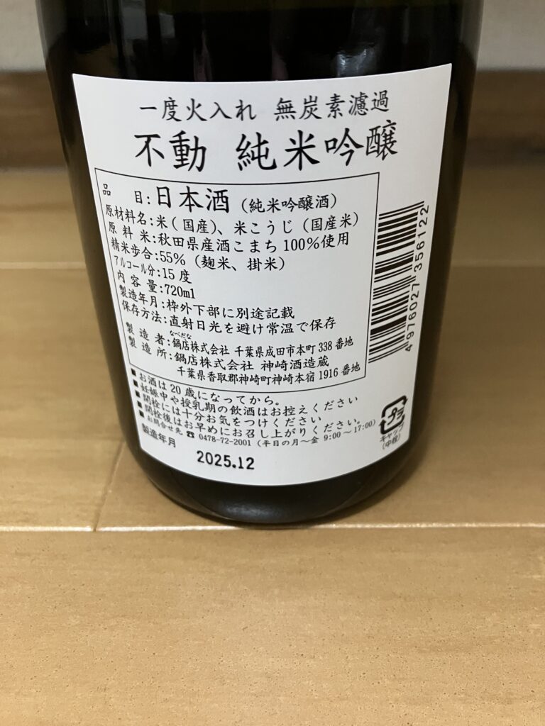 今回美味しく頂いたのは、不動 純米吟醸 一度火入れ